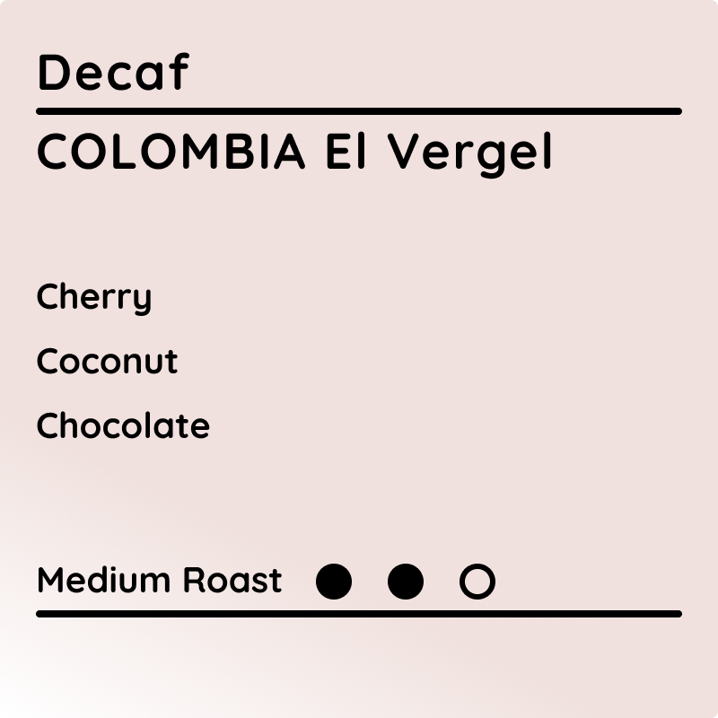 A fruity and full bodied natural processed decaf coffee, with tasting notes of cherry, coconut and chocolate.